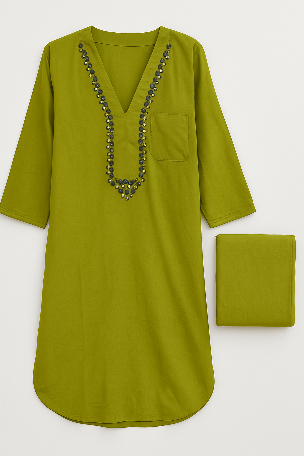 Noor Olive Mirror-Embroidered Cotton Kurta Set