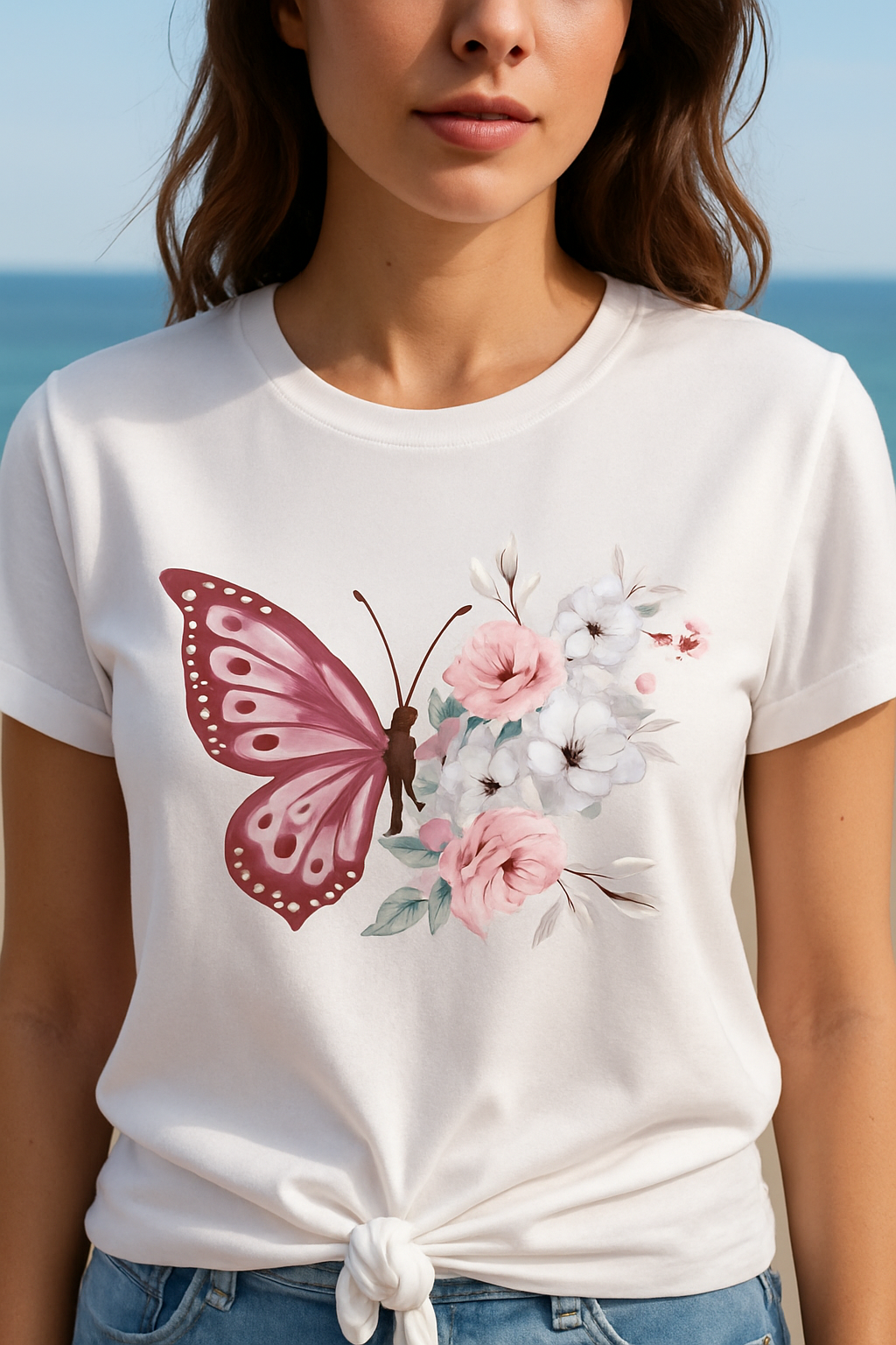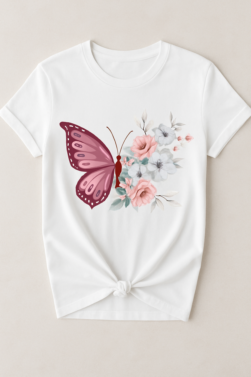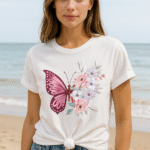 Elevate your everyday wardrobe with Velvet Èlan’s FlutterBloom Cotton Tee – where comfort meets artistic elegance. Crafted from breathable, premium-quality cotton, this white tee features a vivid magenta butterfly and a soft bouquet of pastel flowers, creating a harmonious blend of charm and freshness. The knotted hemline adds a touch of casual flair, perfect for pairing with denim or flowy skirts.