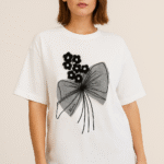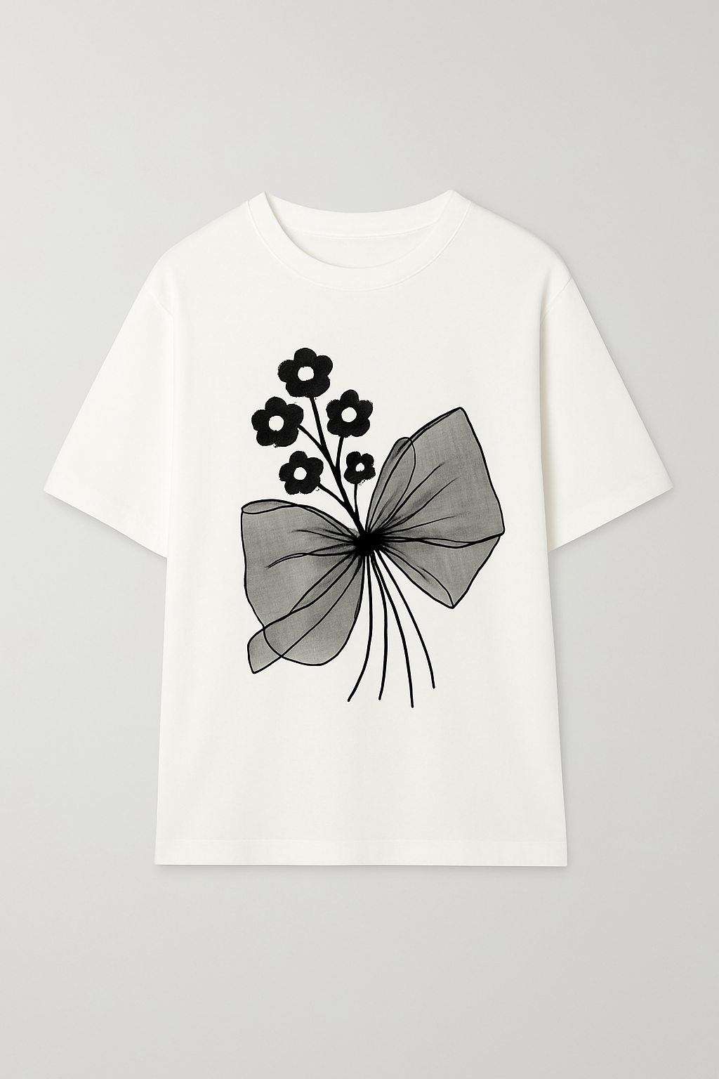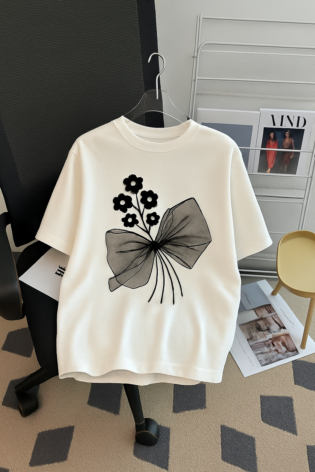 Bring elegance to your casual wardrobe with the Velvet Élan Noir Bloom Bow T-Shirt. This classic white tee is elevated with a stunning black bow and floral applique detail, adding a touch of modern minimalism and artistic charm. The high-quality print combined with a relaxed silhouette makes it a perfect pick for daily wear or an elevated casual look.